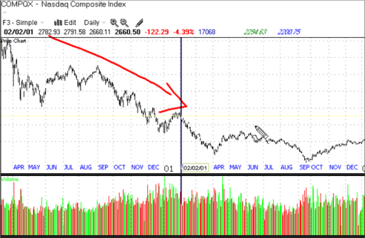 De nuevo, la siguiente gráfica en la imagen 2.7 amplia el mismo período que nos estamos refiriendo, el año 2000, y vea como todavía en el año 2001 las acciones seguían bajando.