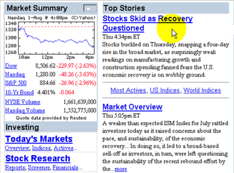 Observe las siguientes noticias de la imagen 2.8 corresponden al 1 de agosto del 2002, de Yahoo! y vea como los sitios de finanzas y los mercados seguían cayendo. Se preguntan acerca de la recuperación económica sin saber si habrá una recuperación o no.