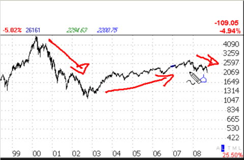 Todas las noticias mostradas anteriormente fueron ocurriendo en el período de tiempo del año 2000 al 2002. Luego la bolsa subió y ahora, como mencioné, en el año 2008 ha venido hacia abajo, lo que puede verse en la siguiente gráfica de la imagen 2.12