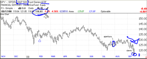 Lo que ha hecho el precio de la acción es caer. Vea como el precio de apertura de la transacción estaba alrededor de más o menos USD$127 y al cierre (17 de sep. del 2008) está alrededor de los USD$116.